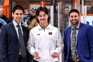Easton Daneault receiving his CJHL Rookie of the Year award from Kevin Hasselberg (l) and Kenton Levesque (r); image courtesy of K4 Kreative Beauty and Photography.